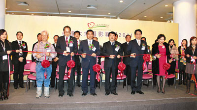 ■嘉宾为心连大地摄影展开幕仪式剪彩。 香港文汇报记者解玲 摄
